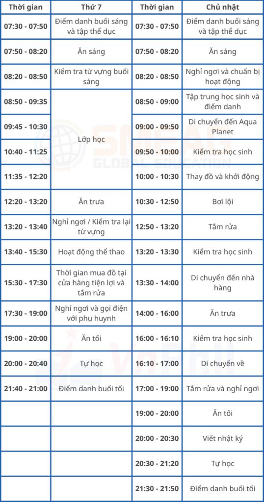 • Thứ 7: học kết hợp hoạt động ngoại khóa